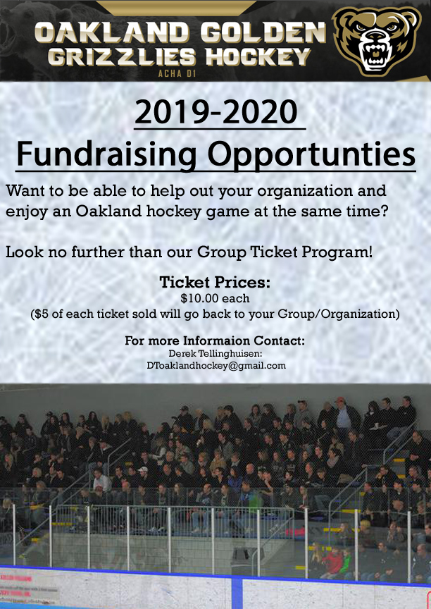 Attend an Oakland ACHA DI Hockey game as a Fundraiser for your group! Contact Marketing & Sales Director Derek Tellinghuisen Below!